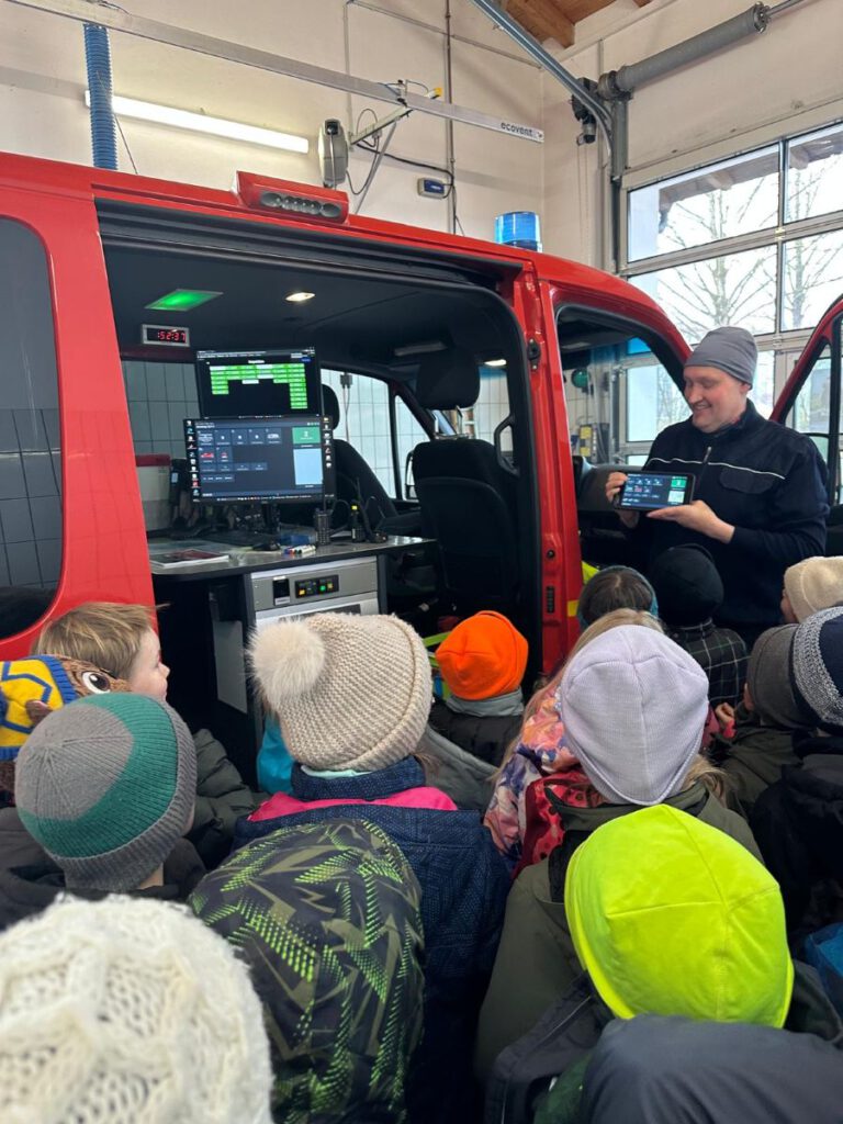 Danach schauten wir uns noch die verschiedenen Fahrzeuge an, erfuhren vieles über die verschiedenen Geräte, die in den Fahrzeugen untergebracht sind und wir wissen jetzt auch was die verschiedenen Farben, Striche und Punkte auf den Helmen und Jacken bedeuten.