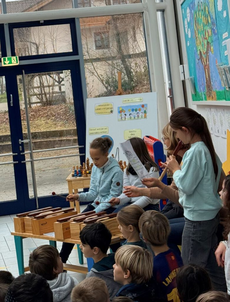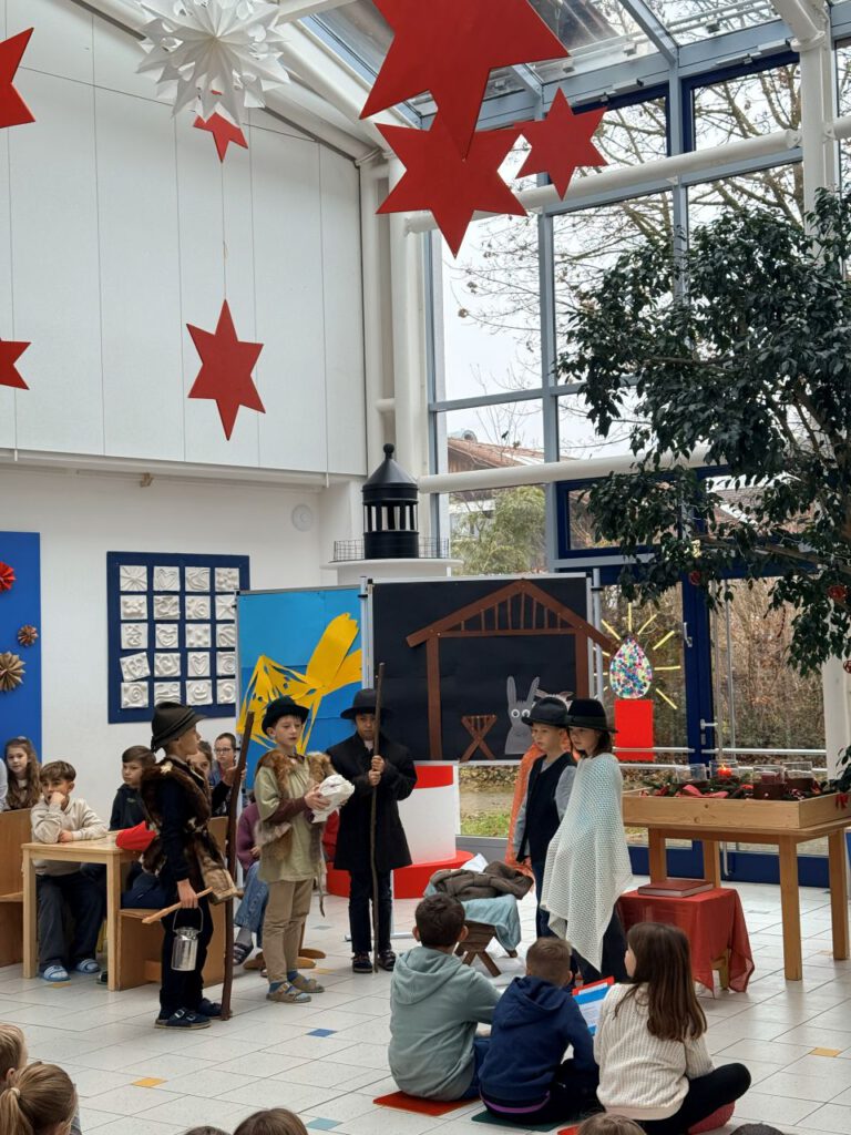 In der zweiten Adventsbesinnung stand für die Schülerinnen und Schüler am Schulhaus Amerang dieses Jahr ein ganz besonderes Highlight auf dem Programm. Nach fleißigem Proben und Textlernen, führten die Kinder der 3A das von Frau Kapsner selbstgeschriebene Krippenspiel in der Aula auf. Vor liebevoll gestalteten Requisiten beeindruckten die Kinder ihre Mitschülerinnen und Mitschüler mit ihrem schauspielerischen Können und vor allem die bayerischen Texte stießen auf große Begeisterung. Die Klasse 3/4 A begleitete das Krippenspiel musikalisch mit einem Stabspiel, einem beeindruckenden Trompetensolo und einer tollen Blockflötenbegleitung einzelner Schülerinnen und Schüler. Gebannt folgten die Kinder der Geschichte und ihrer musikalischen Umsetzung! Zum Abschluss sangen alle Kinder in der Aula das Lied „Zünd ein Licht an“.