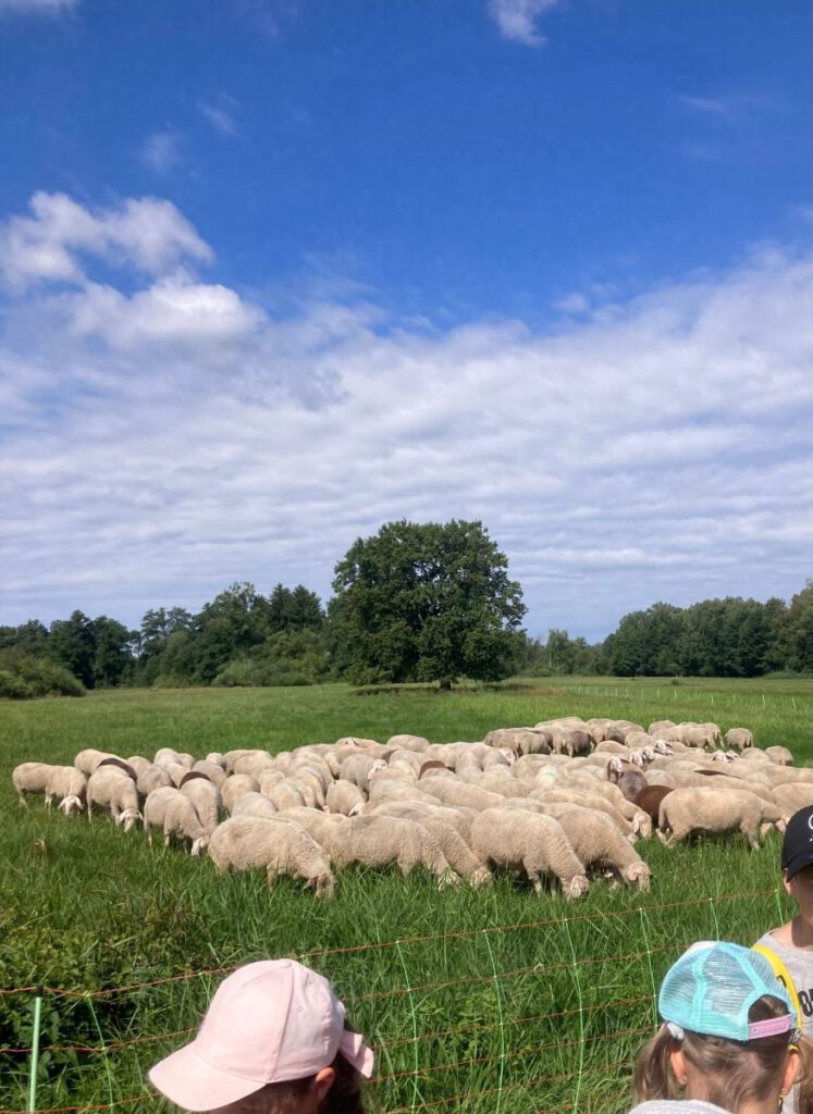Der zweite Wandertag der Klasse 1/2A führte zu den Weiden der Schäferei Fröwis im Ameranger Moos. Gut gelaunt und ausgerüstet mit Brotzeit und festem Schuhwerk startete die Klasse an der Schule und wanderte ins Ameranger Moos, wo wir von Herrn und Frau Fröwis schon erwartet wurden. Als Erstes durfte die Klasse die Schafsherde zusammen mit den Schäfern und Hütehund Rex von einer Weide zur nächsten führen. Mit viel Herzblut und Kompetenz beantworteten Herr und Frau Fröwis im Anschluss daran die Fragen der Kinder. Als Highlight brachten die beiden ein Mutterschaf mit Lämmchen vom Hof mit, das die Kinder bestaunen und auch streicheln und füttern durften. Auch über das Scheren der Schafe haben wir einiges erfahren. Besonders spannend war es, eine frische Wollprobe direkt nach dem Scheren sowie eine gewaschene Wollprobe zu befühlen – und beides durften wir sogar mit nach Hause nehmen. Als weiteres Präsent der Schäferei erhielten die Kinder darüber hinaus eine Seife, hergestellt unter anderem aus dem Schafsfett Lanolin.